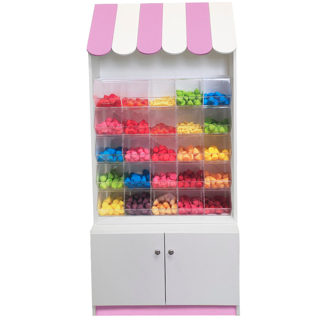 Mueble con carameleras, fabricado en melamina blanca combinado con color a escoger. Los detalles en color son lacados. Cuenta con 25 carameleras de metacrilato Plexiglas de 4mm transparente.